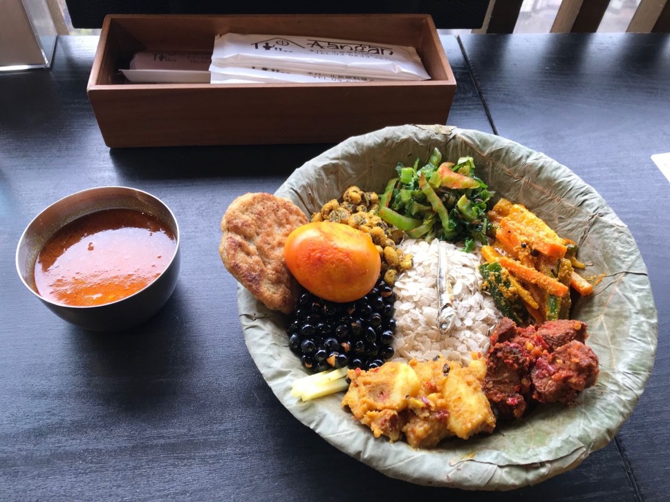 辛いけど大丈夫ですか?と店員さんが確認してくれます。色んなおかずがついてますが一番辛いのはマトンのスパイス和え。お口直しに生生姜のスティックがつきます。ボリボリの黒豆や噛み締め系の干し飯などの食感も楽しい。