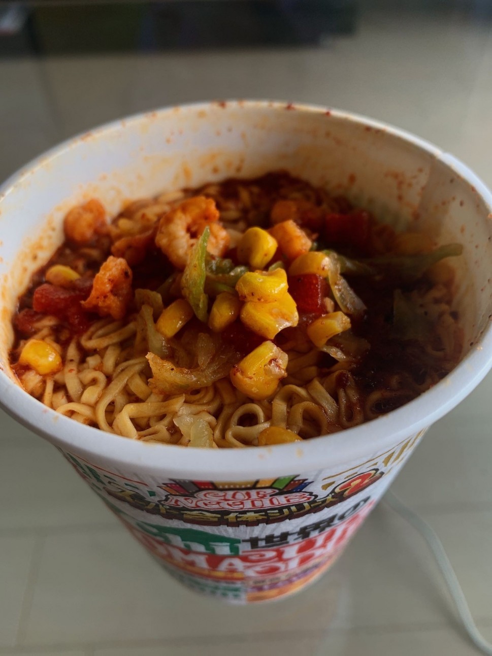 トムヤムクンの独特な香草感は弱く、酸っぱいチリヌードルといった感じ。これはこれで美味しいけど辛さは殆どない!でも、カイエンヌペッパーとの相性が良くて大量に入れても味を損なわず美味しくいただきました。