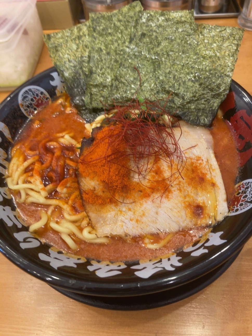 見た目の割にはそこまで辛くない。うまく家系ラーメンとの調和を取れてる点はナイスポイント。カイエンペッパーがヒリヒリ辛いラーメンです。