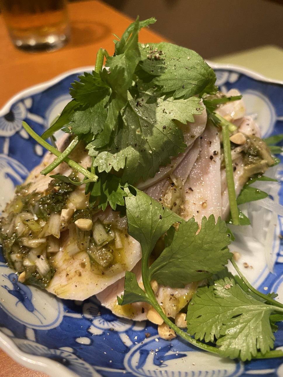 多彩な肴の中でよだれ鶏も赤ではなく緑。青唐辛子ソース+パクチーでフレッシュな辛み