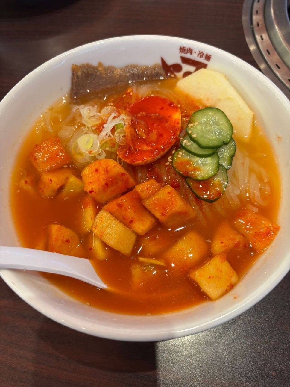 辛さはピリ辛程度ですがボリュームがあり美味しい冷麺です♪