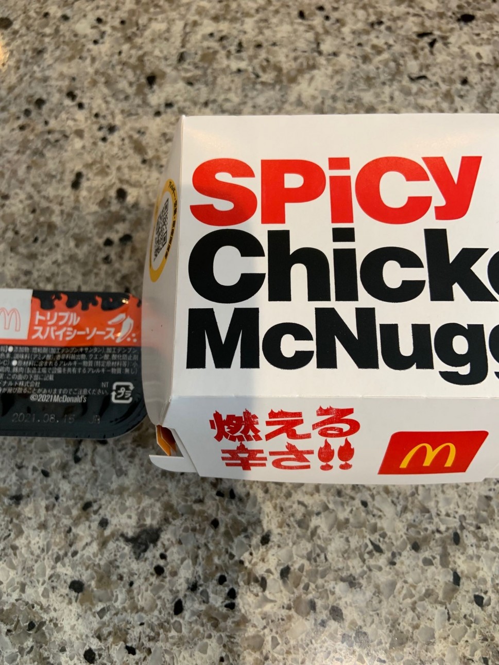 ナゲットの辛さは全く。ソースはトリプルスパイシーソースにてみたけど、確かにスパイシーではある。胡椒辛い。唐辛子とかの辛さではない。