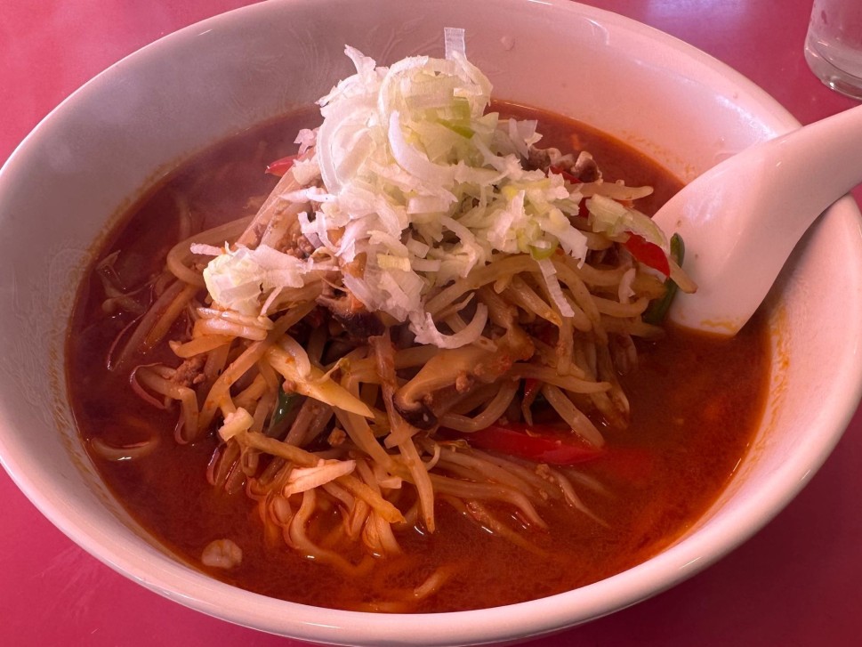 真っ赤なスープに白ネギが美しいラーメンで、具材は挽肉にたっぷりのもやしと椎茸、筍、パプリカなどたっぷり入ってます。