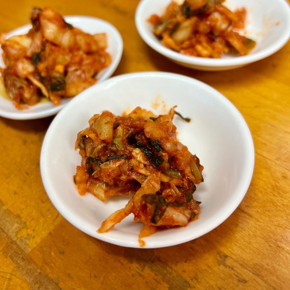 うどんに入れる用の無料キムチ。かしわおにぎり🍙との相性も抜群なんです。三杯のキムチをうどんに入れると、だいたい2.45KMくらいまでは上がります🔥