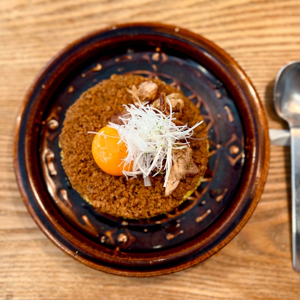 軟骨入りの冠地鶏キーマが、出汁が満点で美味です。柚子胡椒がほんのり最初に挨拶してくれて、卵黄でさらに円やかに🥚 スパイスもインドの方、直伝とか👳♂️