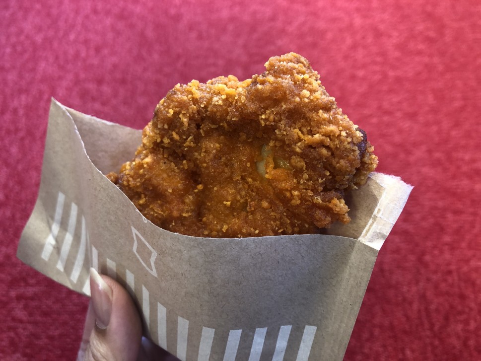 衣のカリカリと中のやわやわがくせになるLチキ。ジャンキーでも塩辛くても気にしない。普段の辛に🌶鼻と頬などにうっすら汗。