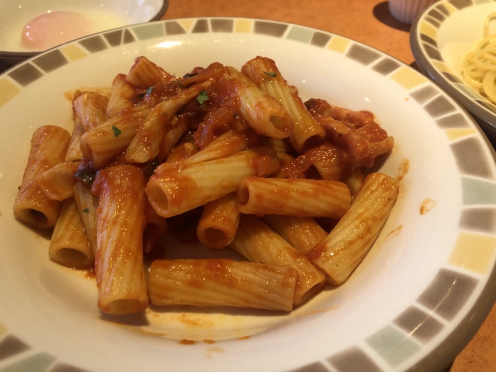 やさしい辛さ。甘み、酸味、ニンニクのバランスで食べやすい味!太いショートパスタ「エリコイダーリ」は食べ応えあり。