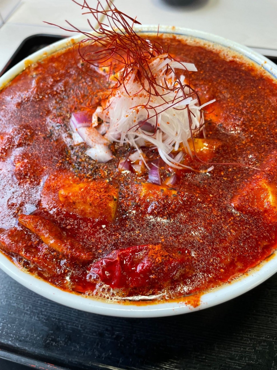激辛麻婆豆が乗っているラーメンです。最初はおいしいのですが徐々に辛さが蓄積していきます…。ご飯と一緒に食べると美味しいですよ。