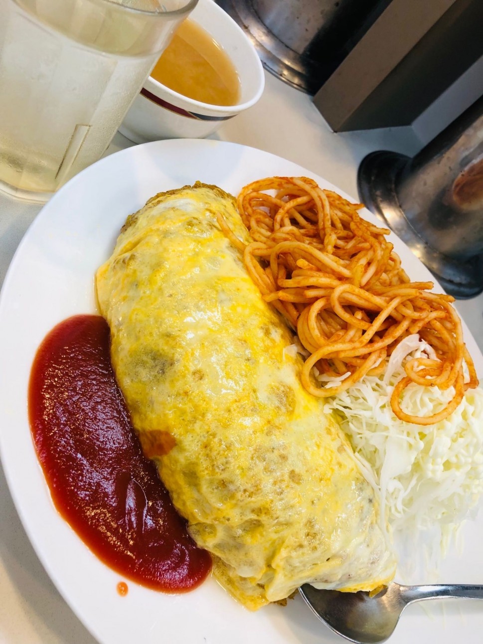 見た目からはわからないちゃんと辛いオムドライです!キャベツにマヨネーズにナポリタンそしてケチャップが。なんかいいです笑