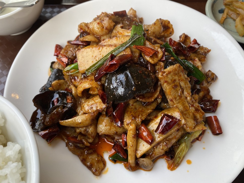 山椒と唐辛子の辛さがダブルで…まさに麻辣ですね!日本ではキャベツと豚肉ですがキャベツは無くてキノコや竹の子やネギなどがふんだに使われている本格的な回鍋肉は以前成都で食べた回鍋肉と同じくらい美味しかったですね!辛さはピリ辛がちょうど良いバランスでした!