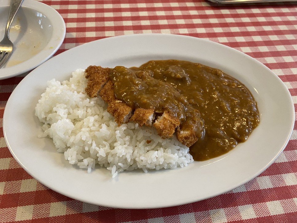 神戸市に来ました!1933年創業のグリル十字屋でカツカレーを注文!見た目は甘めの昔ながらのカレーかと思いきや!食べると程よいピリ辛です!汗までは出ませんが十分に辛さを楽しめます!カツもカラッと上がったこれぞカツカレー!というカツでした!
