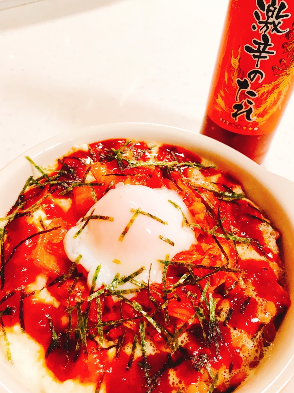 たれをぐるり一周かけても痛みのない美味しい辛さ。ニンニクと野菜の旨味が具材に絡みつき食欲を唆る。画像はゲキカラドウで猿川くんが食べていた納豆キムチ丼。大和芋追加♡