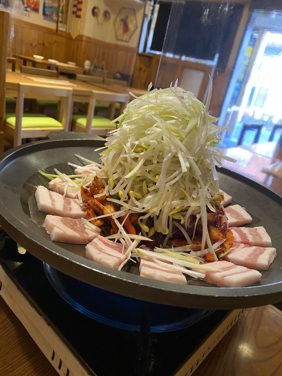 青唐辛子を入れるといい感じに辛い!蛸と豚肉と葱と青唐辛子がとても合ってておいしかったです!ちなみに青唐辛子なしだと全然辛くないです!