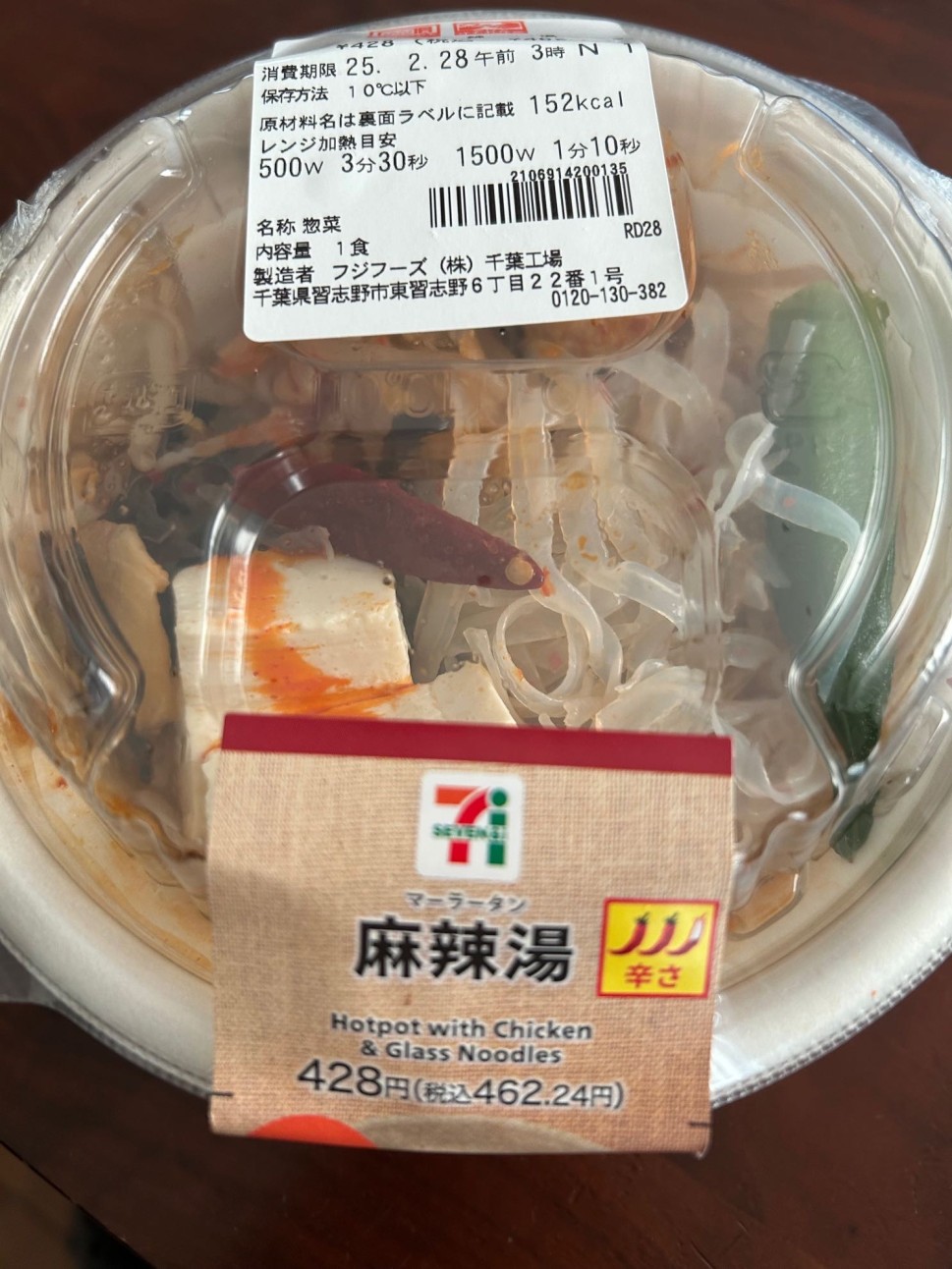 最近流行りの麻辣湯。コンビニ辛パト(辛い物パトロール)にて発見💡しっかり辛さもあって、味も本格的で美味しかったです♪具も好み。追いシビ、追いカラにて美味しくいただきました。少々お高いけど、リピート🔁します。