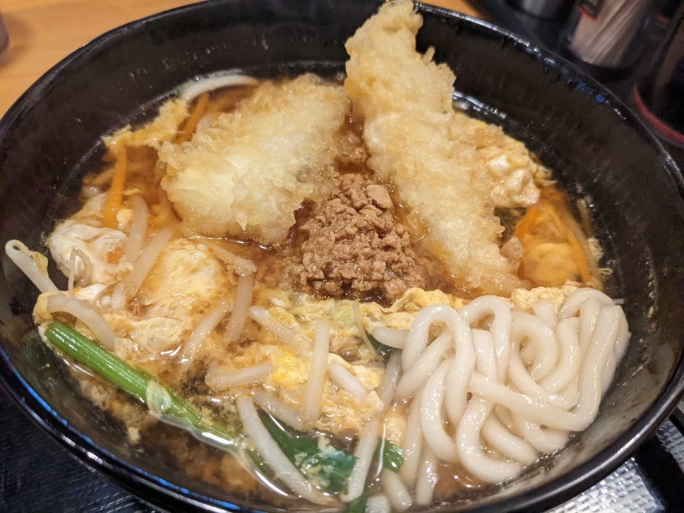なかなかチャレンジングな新メニュー。野菜卵とじ、ひき肉、イカ天、エビ天にうどん。韓国っぽいけど、スメが甘すぎて。ひき肉の辛味に期待するも、空振り。