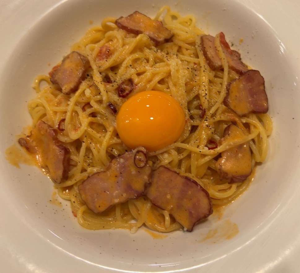 ヨード卵・光と吊るしベーコンのレッドカルボナーラ