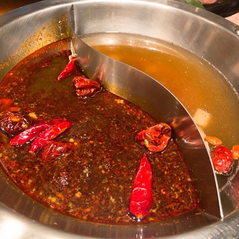 赤いスープに浮かんでいる唐辛子を齧ってみてください!
