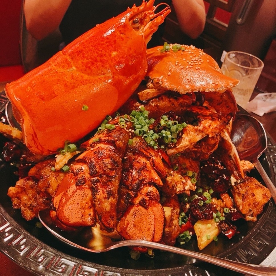 なんと!1.3kg以上の特大オマール海老がのった贅沢麻辣海鮮香鍋を注文☆