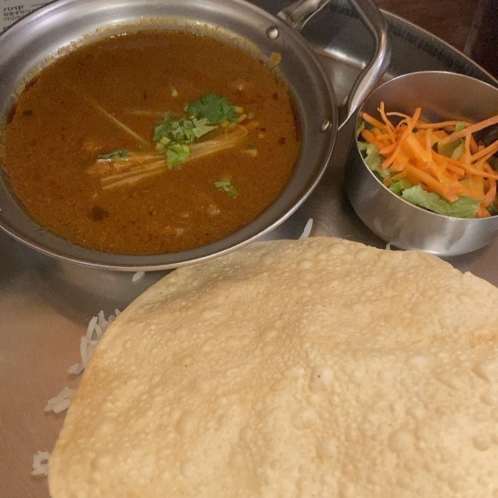 まず、パパドって南インドのカレーにはスタンダードで付いてくるものなんですが(薄いおせんべいみたいなものです)これをまずお好みで砕いてライスにかけたり、途中でそのままかじったりします。