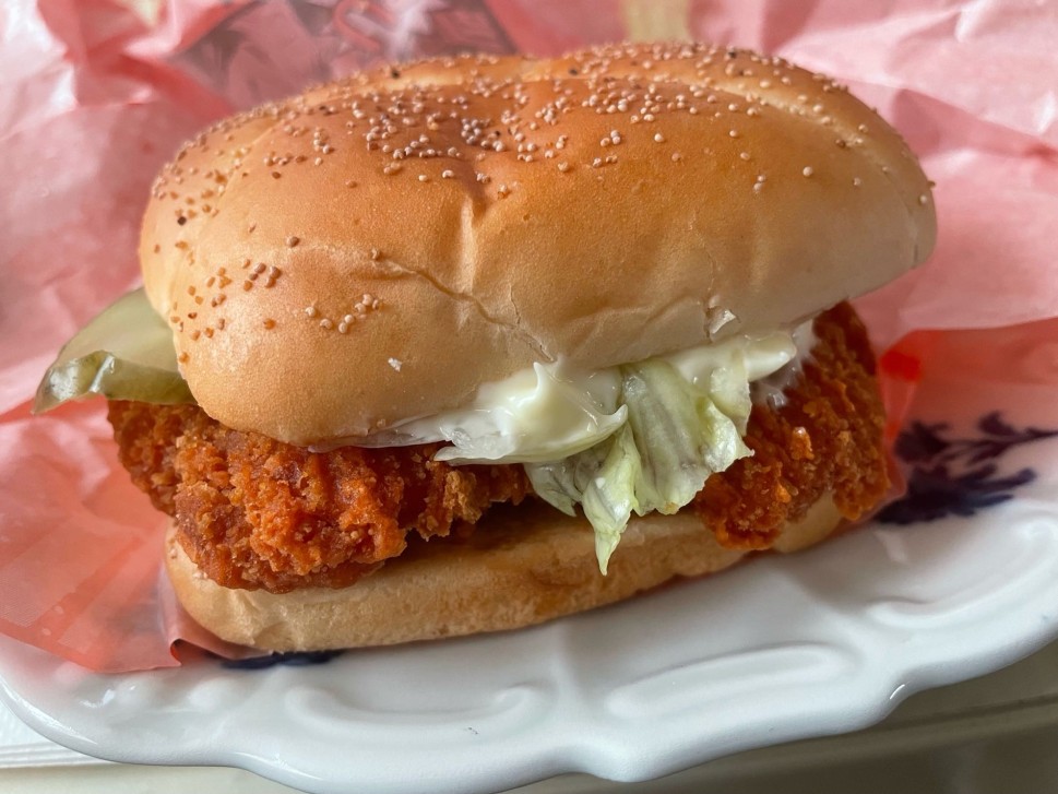 食べ始めは普通のフライドチキンバーガーですが、食べ進むとしっかり辛さが舌を襲います。