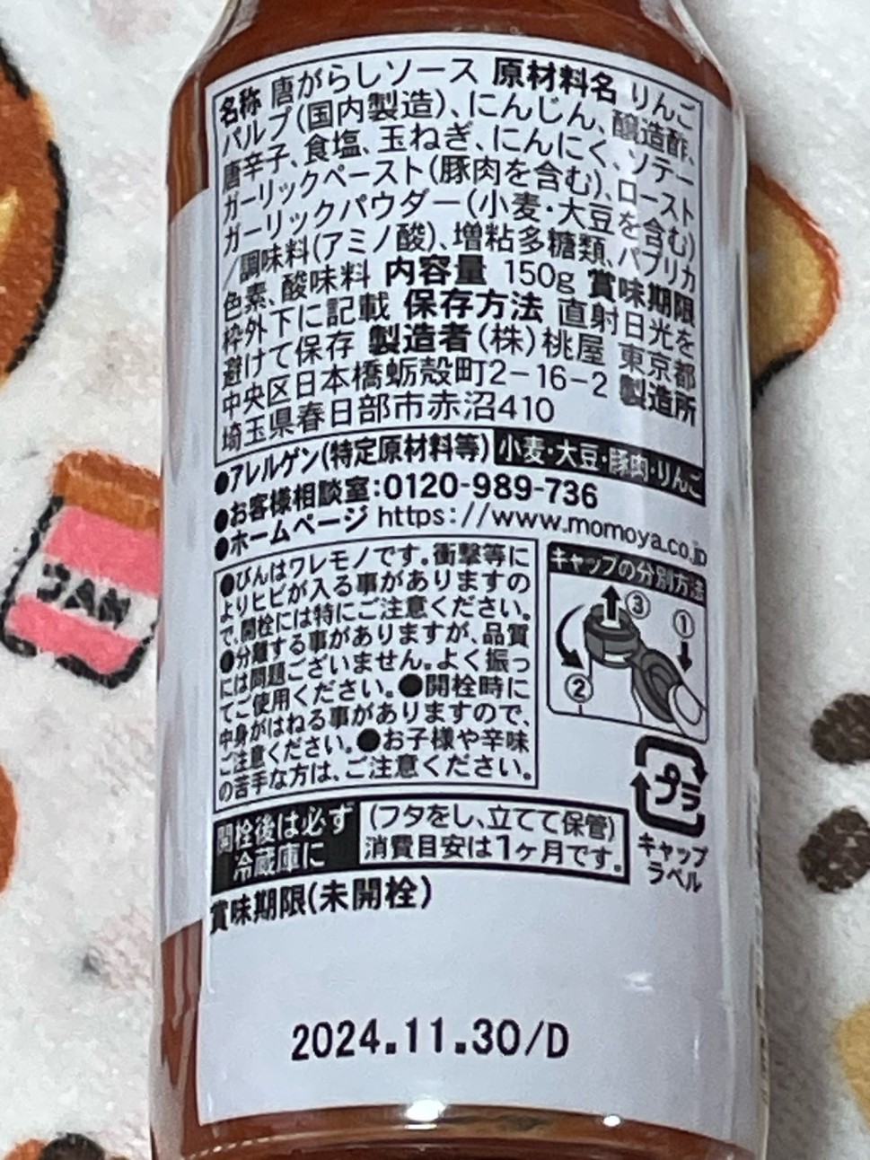 原材料名:りんごパルプ、にんじん、醸造酢、の後にようやく唐辛子。