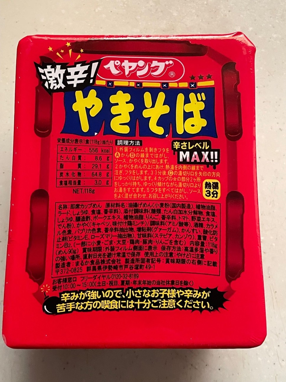 獄激辛を食べ慣れてると追い辛したくなりますが、辛メータージャッジの為に最後までノーマル状態で食べました。辛ラーメン(カップ麺)が1.88KMなので、2KMくらいかと思います。ただペヤング(だけでは無いのですが)はロット毎に辛さのバラつきがあるので、個体差はあると思います。