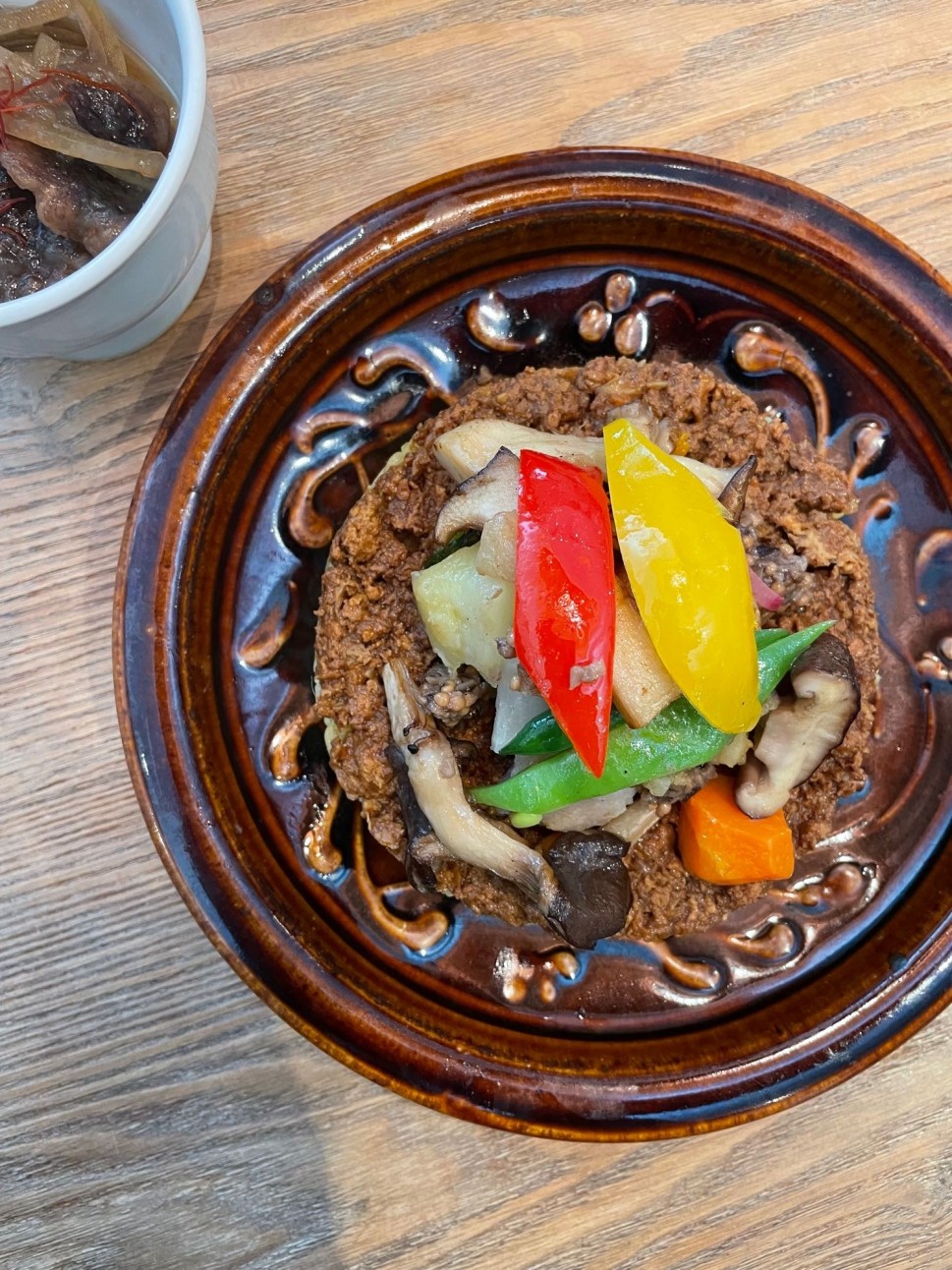 季節のお野菜とスパイスの効いたカレーが美味でほんのり辛み。上に乗っている粒マスタードも良き。