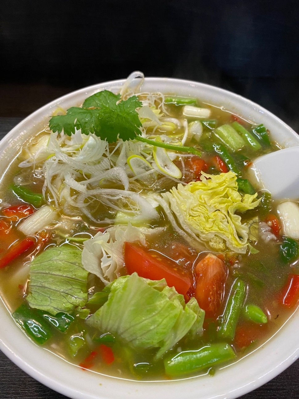 量が多い!!そしてしっかり辛い!オーダー時に本当に辛いが平気か?と質問されます。具もパクチー、ネギ、トマト、パプリカ、んげん、キュウリ、豚肉、エビなどなど沢山楽しめます。辛さの正体は島とうがらしのようです。