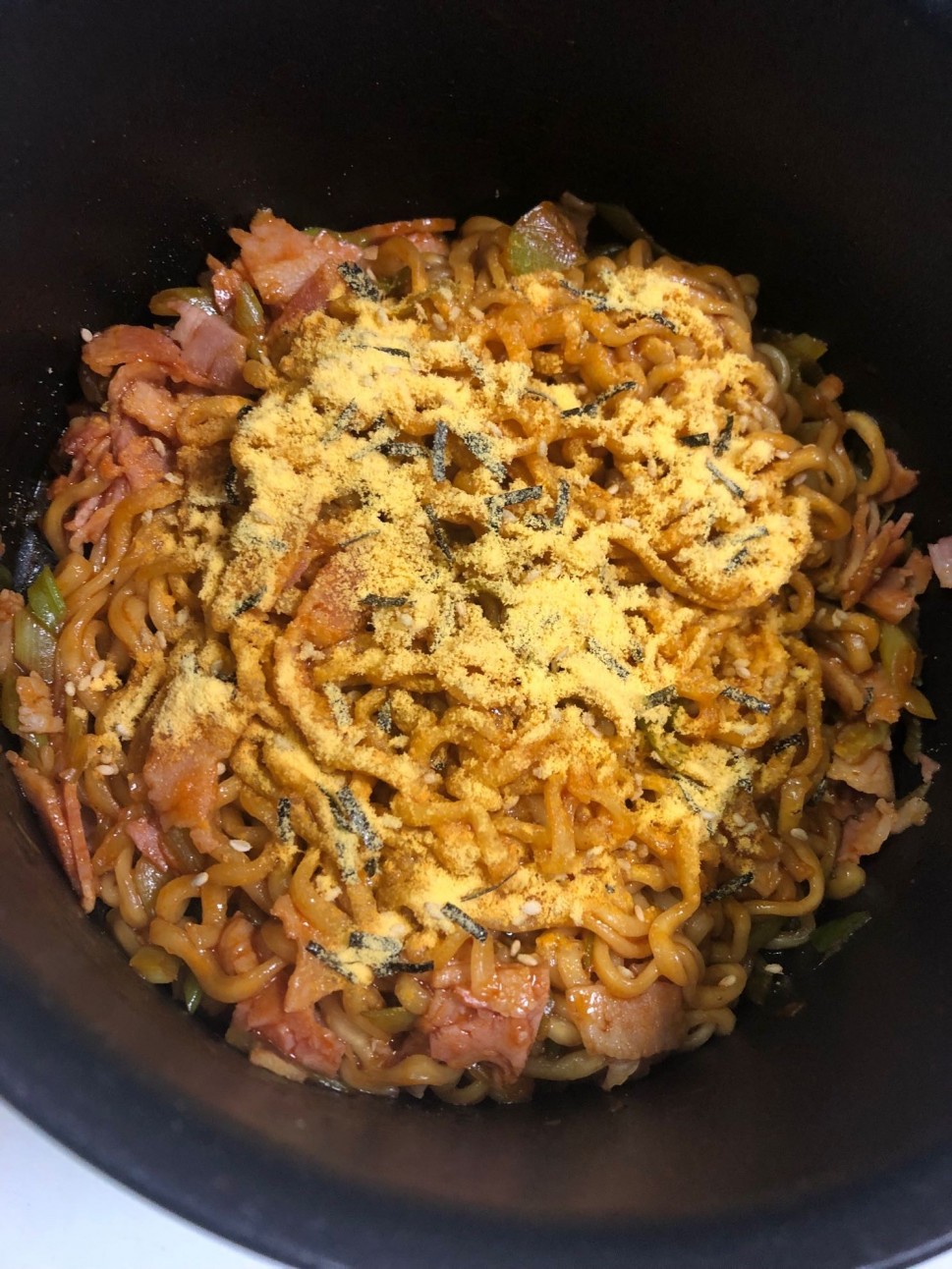 前から食べてみたかったブルダック炒め麺。袋タイプのチーズ味を食べてみました!冷蔵庫にあったネギとベーコンと一緒に調理。チーズ味というのもありまろやかで甘辛い味でした。辛さはどちらかと言うと後からじわじわとくる感じ。麺がもちもちでした♪個人的には少し物足りない辛さなので次は、隣に売られていた黒いパッケージのブルダック炒め麺も食べてみたいです。