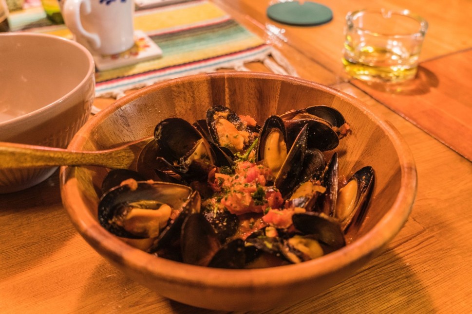 ムール貝食べた後、残りのスープをパスタかトルティーヤチップスをつけて食べるのも美味しい。