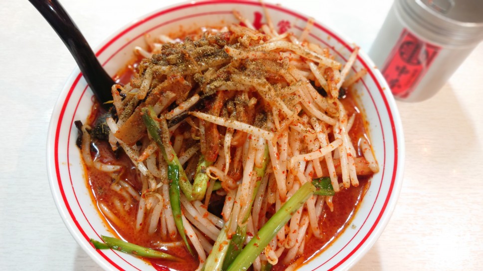 品川店の期間限定メニュー。中本のオリジナル辛さレベルは10以上、北極2倍相当らしい。ちょっと汗はかくけどもっともっと辛さが欲しい!卓上の一味唐辛子を鬼がけして食べました。