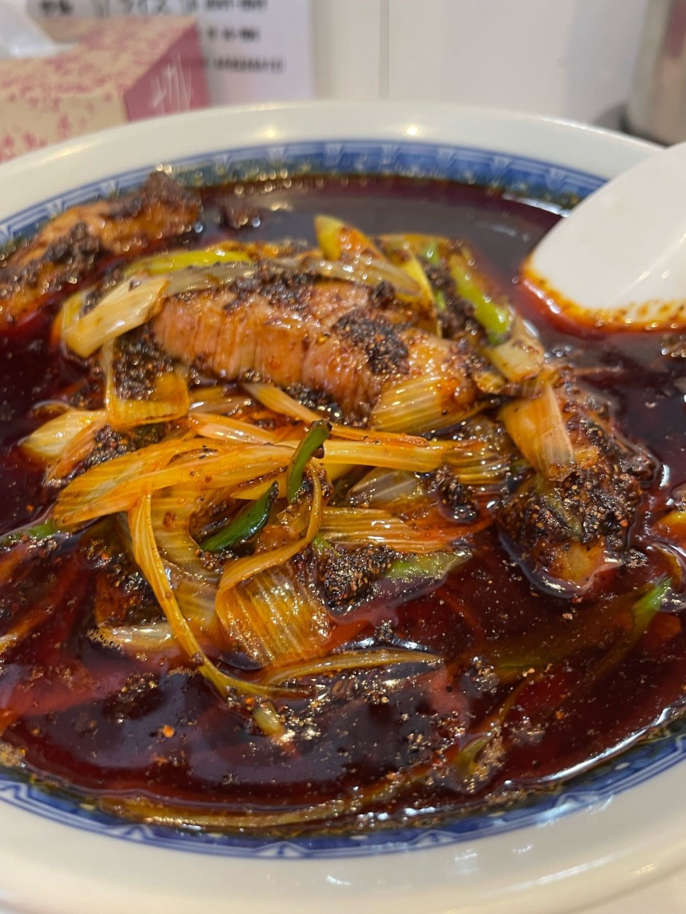 ネギとゴロっとしたチャーシューを炒めた具が食べ応えあって美味しい。ラー油と一緒に炒めているのでやけどに注意。慌てずに食べましょう。