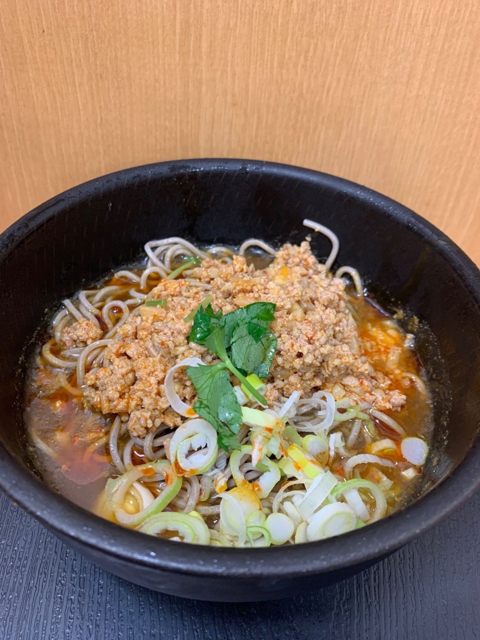 うっすらカレー味の挽肉と蕎麦の上に辣油をかけて提供されるのだけど、冷やしだから油が分離して固まってきますね