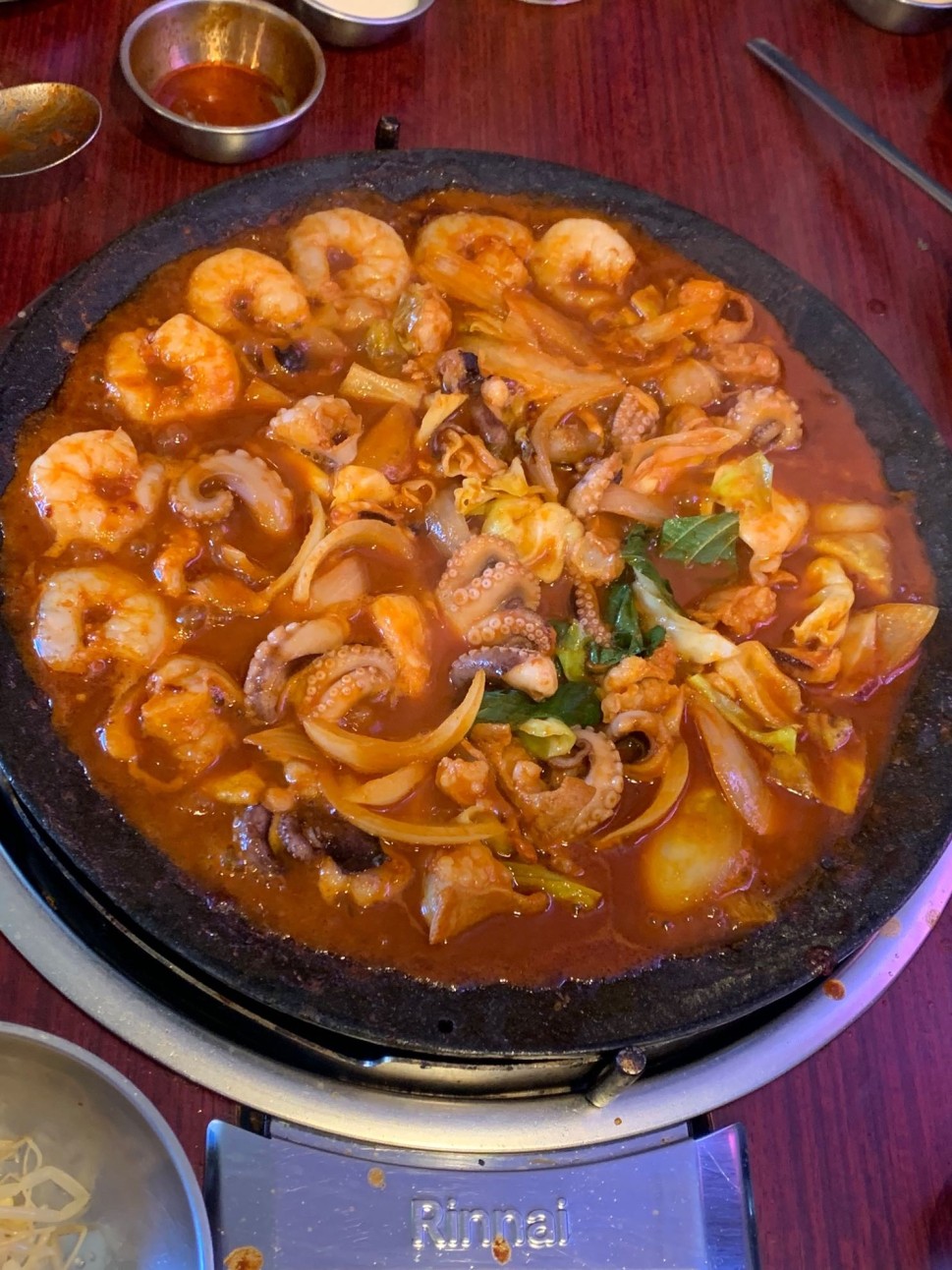 飯蛸にエビと旨みたっぷりですが舌が痛い、多汗をかきました