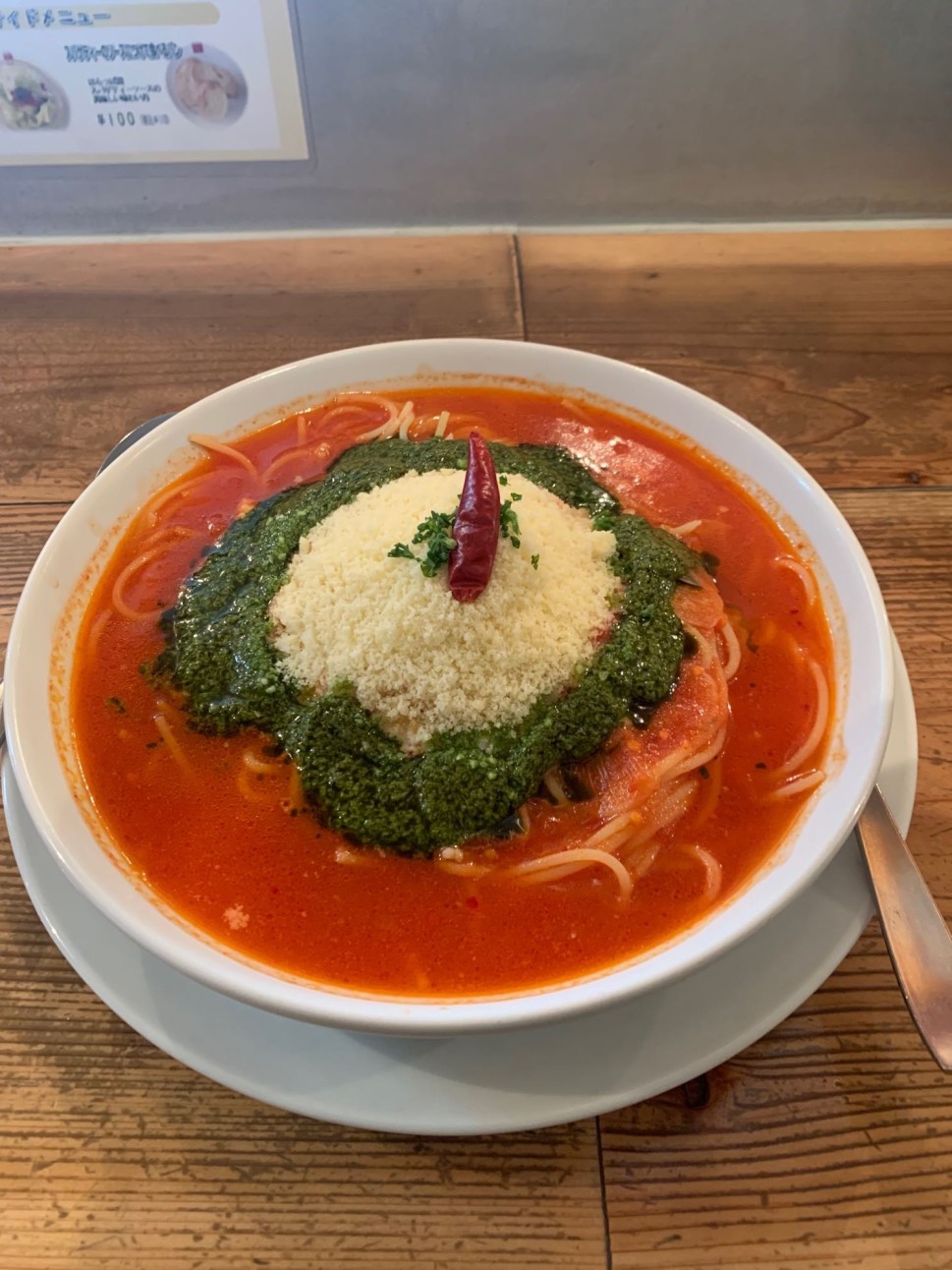 トマトの酸味とチーズがマッチしたスープパスタで刺さっていた唐辛子をかじったらちゃんと辛かった
