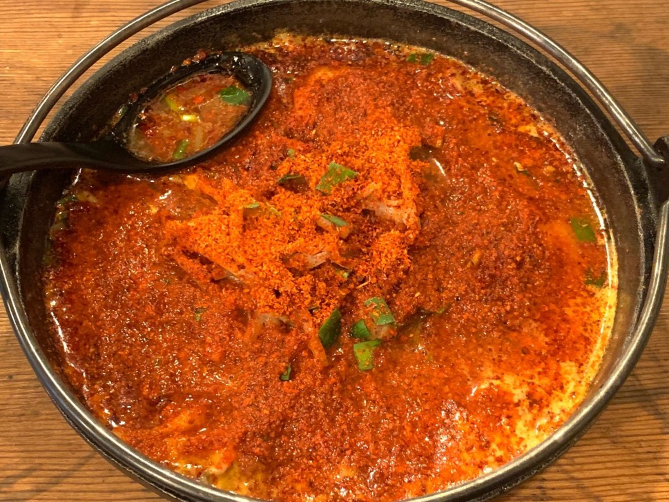 唐辛子の辛味がいい感じのホルモン入りラーメンです。激辛好きには、丁度いい完飲完食が出来る辛さです👍
