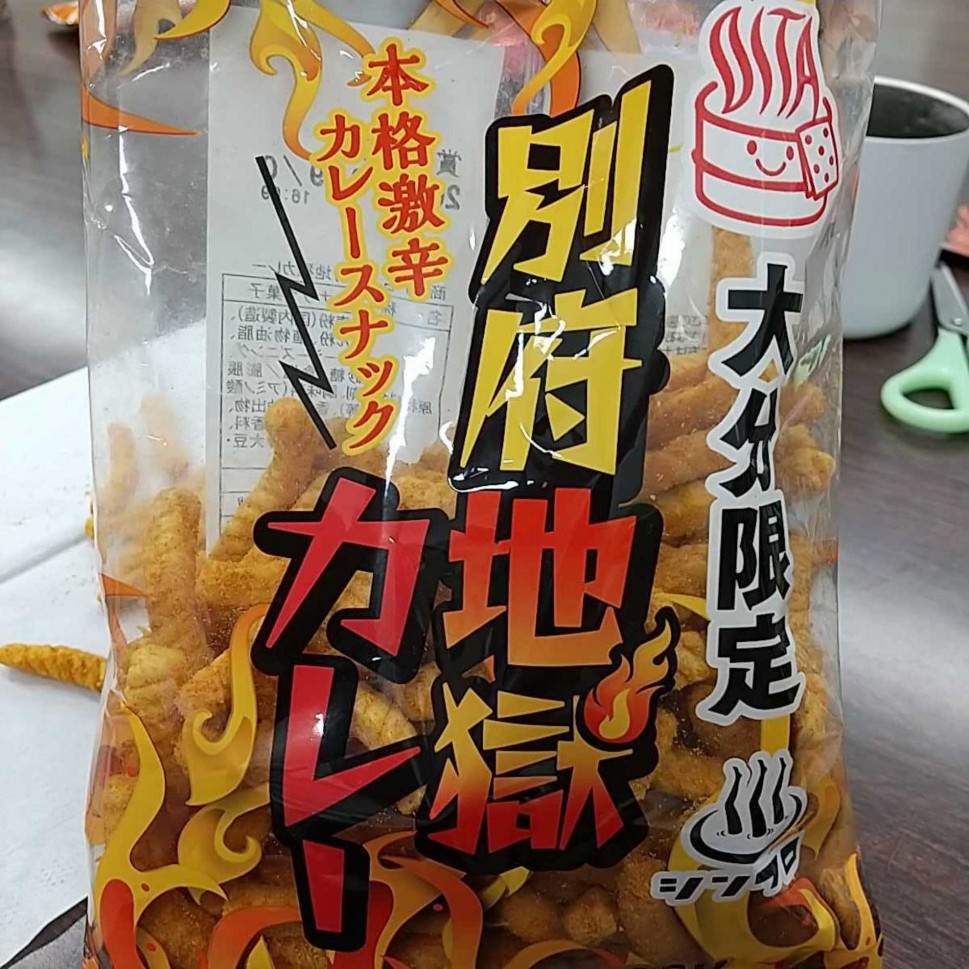 大分のお土産です。カレースナックとしては最も辛い部類だと思いますが、職場の皆で美味しくいただきました。確実にピリ辛を楽しめるのでおすすめのお菓子です。