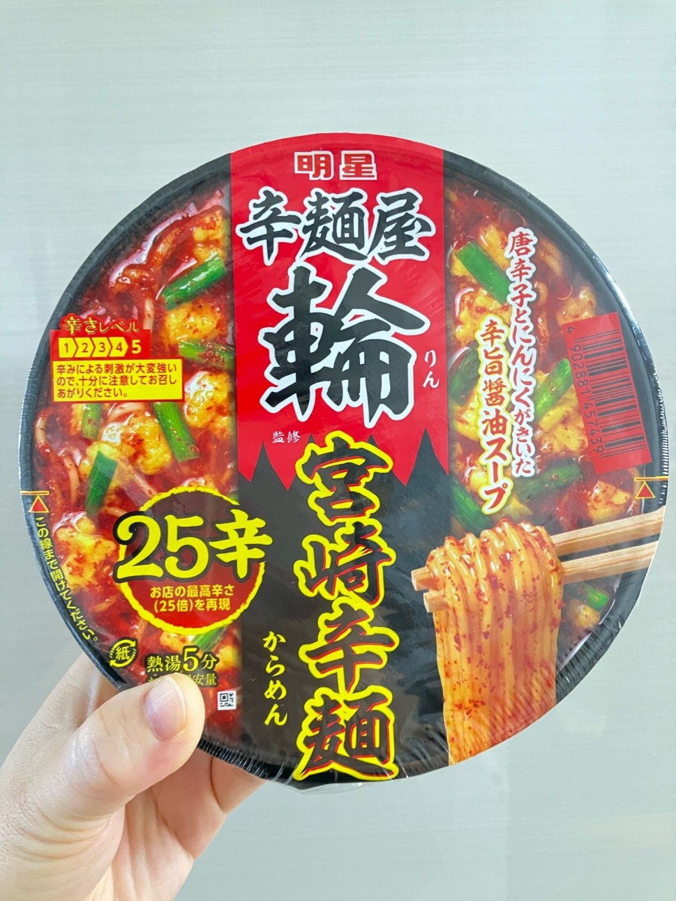数ある宮崎辛麺商品の中で、25辛という表記は辛い方なのかと思いきや。にんにくの風味と塩気は強いですが、かやくの唐辛子の量の割には辛さはマイルドでした。細麺とふんわり卵が絡んで美味しいカップ麺ではあるけれど、辛さを求めるならもう少し欲しいところ。ただ、このサイズでカロリー300kcal台なのはちょっと嬉しいかも🤭