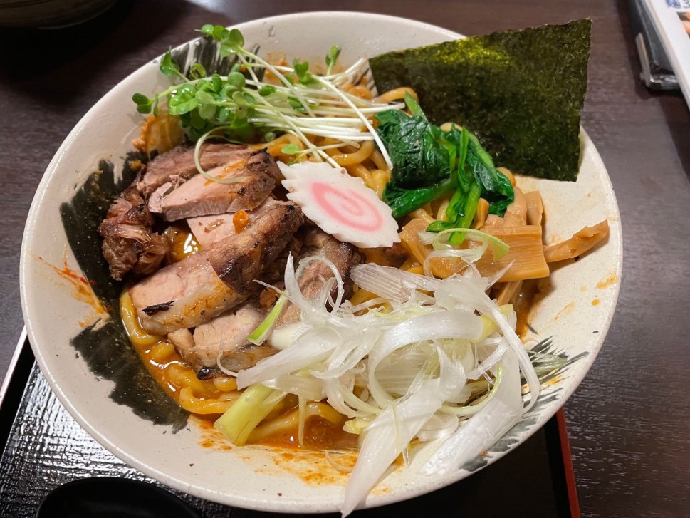 極太麺を咀嚼すると辛さが中和されるのが救いです。