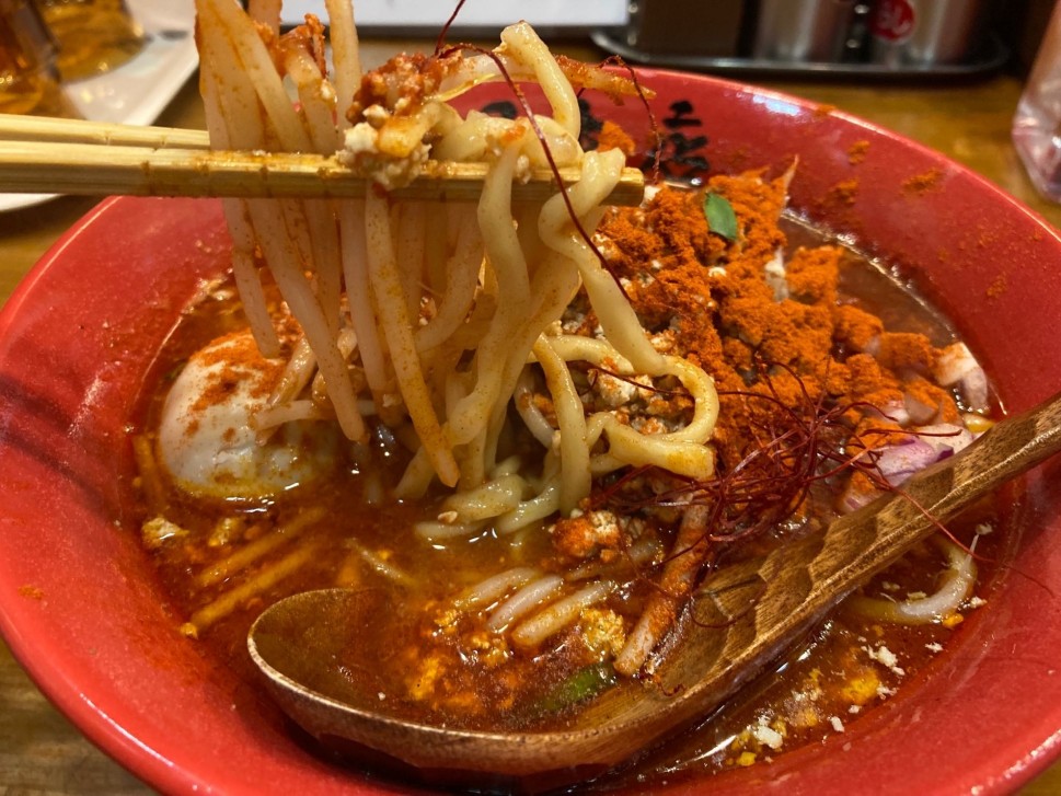 チャレンジメニューのファーストステップである鬼神らーめん(¥1,600)をオーダーしようと思って入ったところ、奥さんがいる日しか提供できないとのことで辛みそらーめん大辛(¥1,000)をオーダー🍜