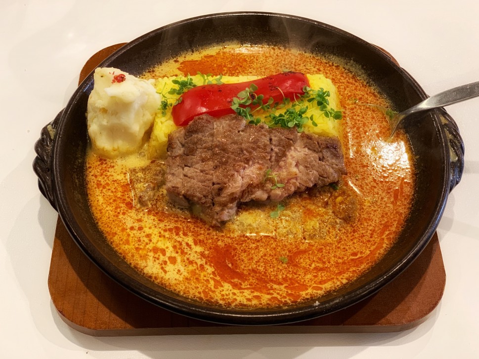 初のRスリランカは3辛からトライ。映える美しさを裏切らず、3辛でもマイルド。豊富なステーキやサフランライスに加え、マッシュポテトで保険を掛けたせいもあるかもです。辛さよりも胡椒が強く、それは喉に絡みます。