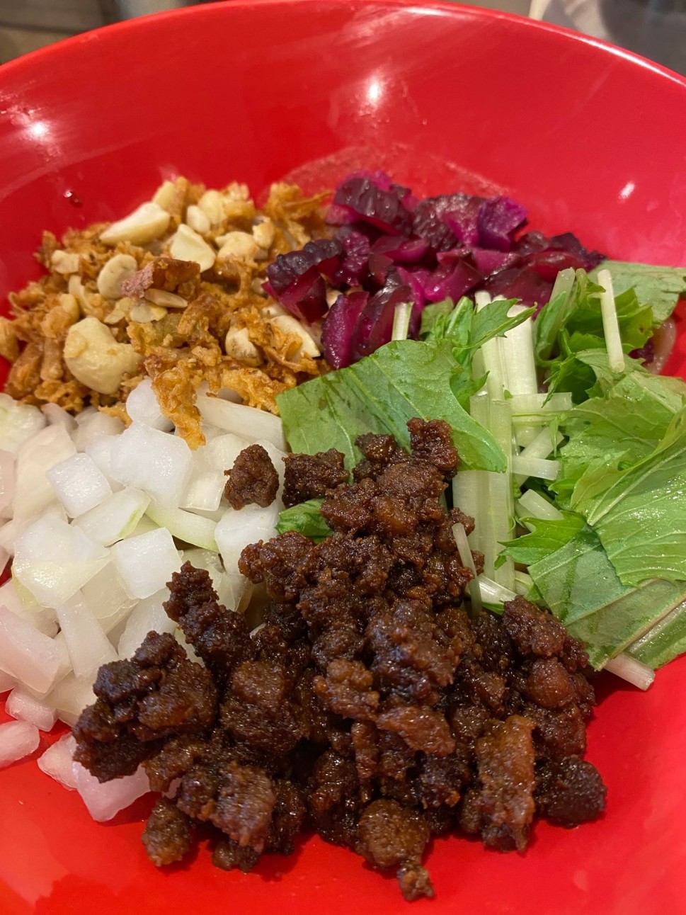 ラーメンは坦々麺というより混ぜそばよりで玉ねぎカシューナッツとしば漬け!が入っているのは斬新で変わった中太平打ち麺とあっています
