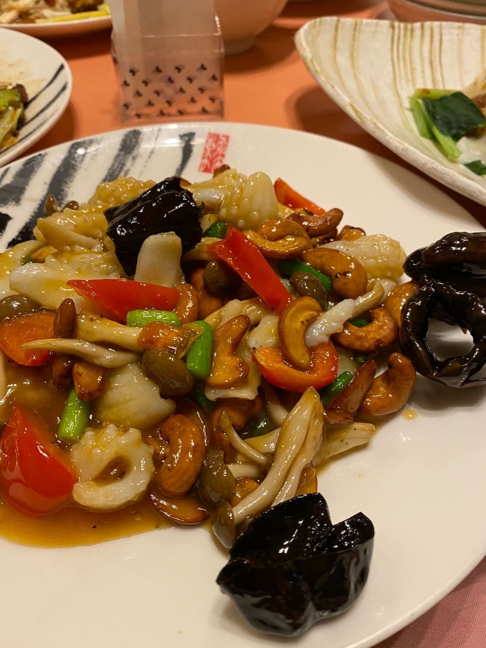 甘辛ダレに柔らかいイカとナッツが良いアクセントで美味しい。乗っている唐辛子も○