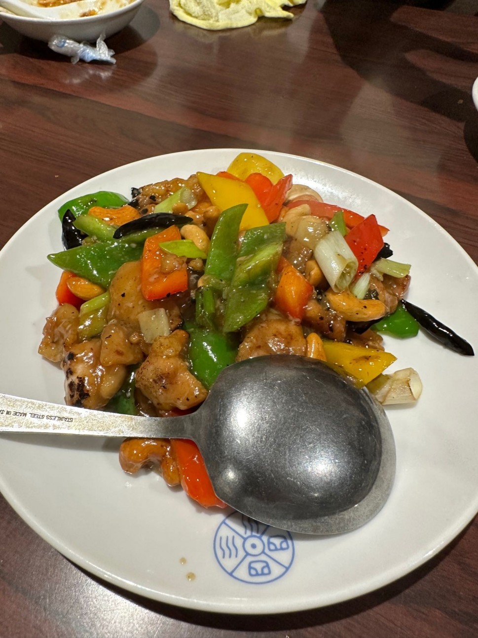 鳥肉がサイの目切りになって野菜と唐辛子と一緒に炒めたピリ辛料理。カシューナッツの歯ごたえがマッチして○