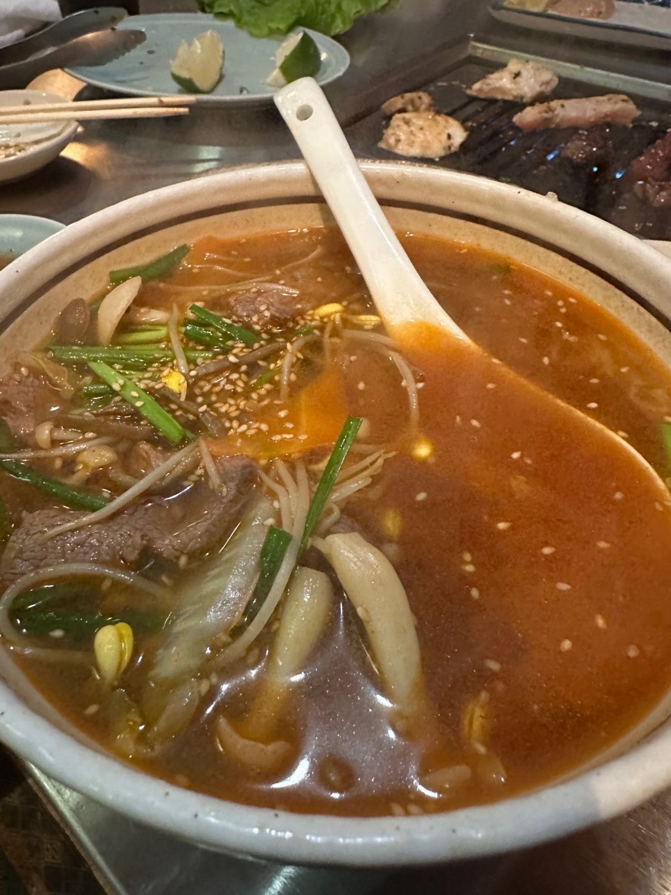メニューの表記では唐辛子🌶マーク×3です。ピリ辛でゴクゴク飲める美味しいスープでした。お肉も柔らかくて○