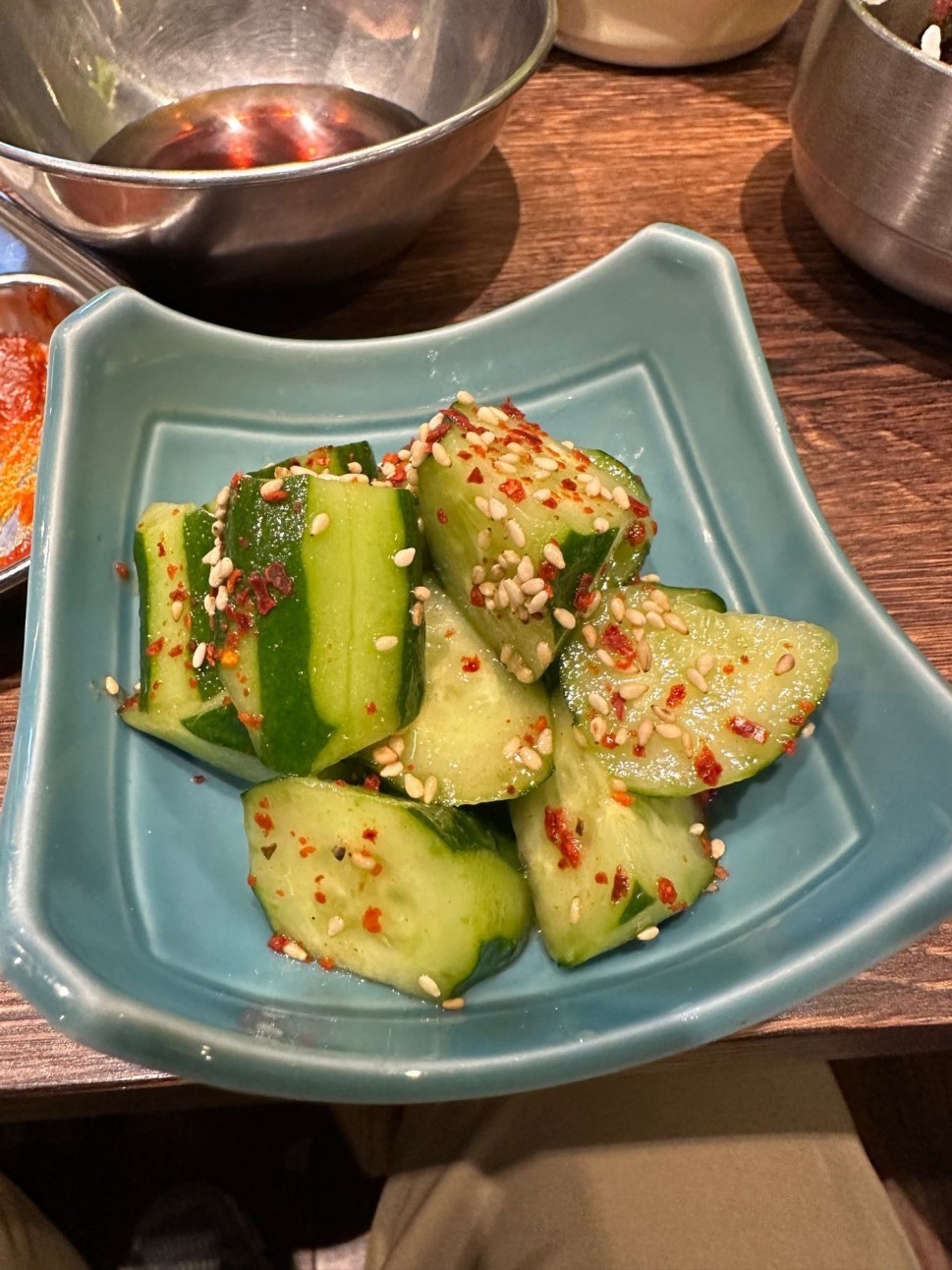 キュウリの浅漬けに唐辛子と胡麻がかかってあっさりして食べやすいピリ辛のアテ
