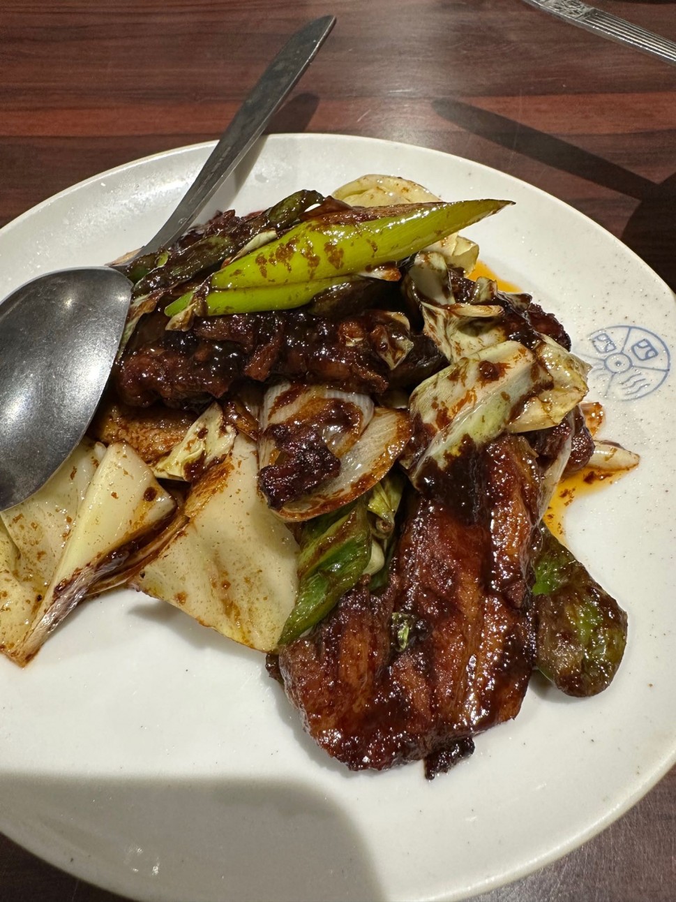 辛さはピリ辛です。甘辛ミソダレがついた豚ロースとキャベツを食べるための料理。ロースはちょっと厚めでカリッとジューシーに焼かれているのはよくある回鍋肉とは違う点。にしてもご飯が進むわー(^^)