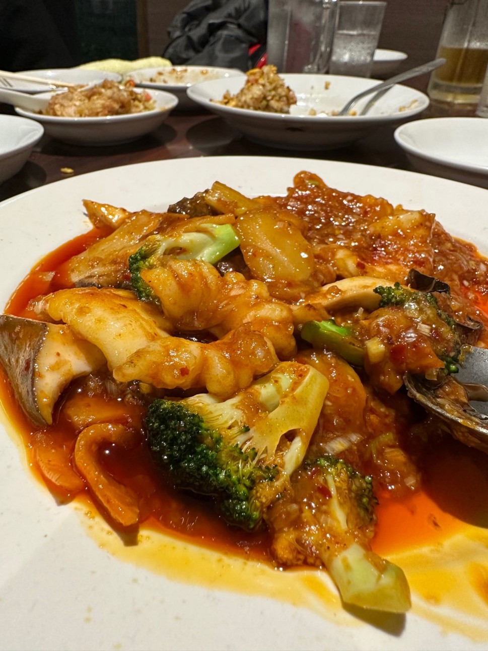 ラー油アンドガーリックの旨辛ダレがたっぷりかかったイカとブロッコリーの炒めもの。イカは抜群の火入れで素晴らしい食感。それにしてもこのタレはやみつきになりそう(^^)