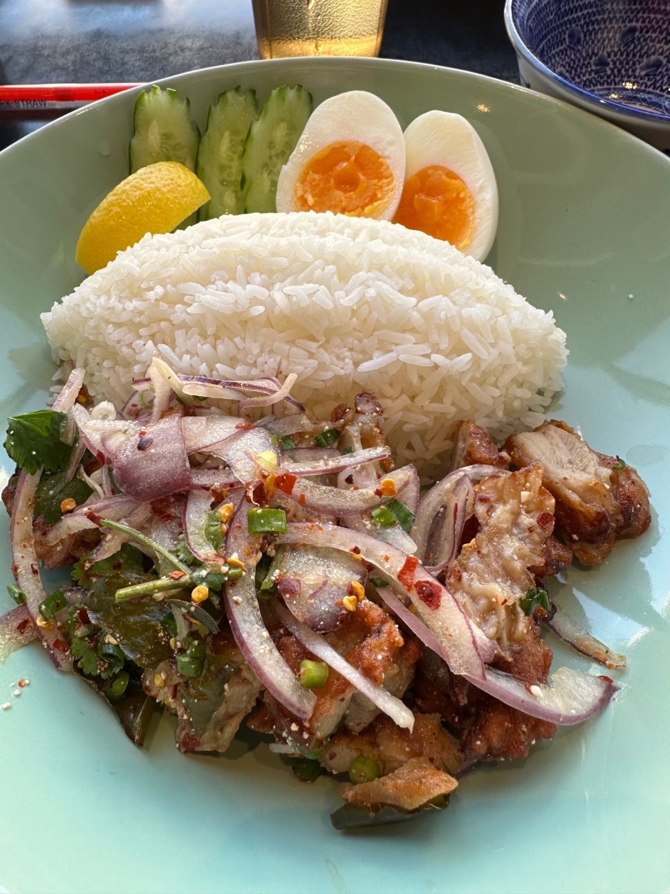 タイ政府公認のタイ料理店でメニューは聞いたことないものまで豊富にあります。ヤムガイトードはガパオライス系ですが、肉は鳥唐揚げが刻んでありパクチーたっぷりでスパイシーな味付けで混ぜて食べると相性バッチリでした。辛さは食べ終わった余韻でやってくるタイプでした