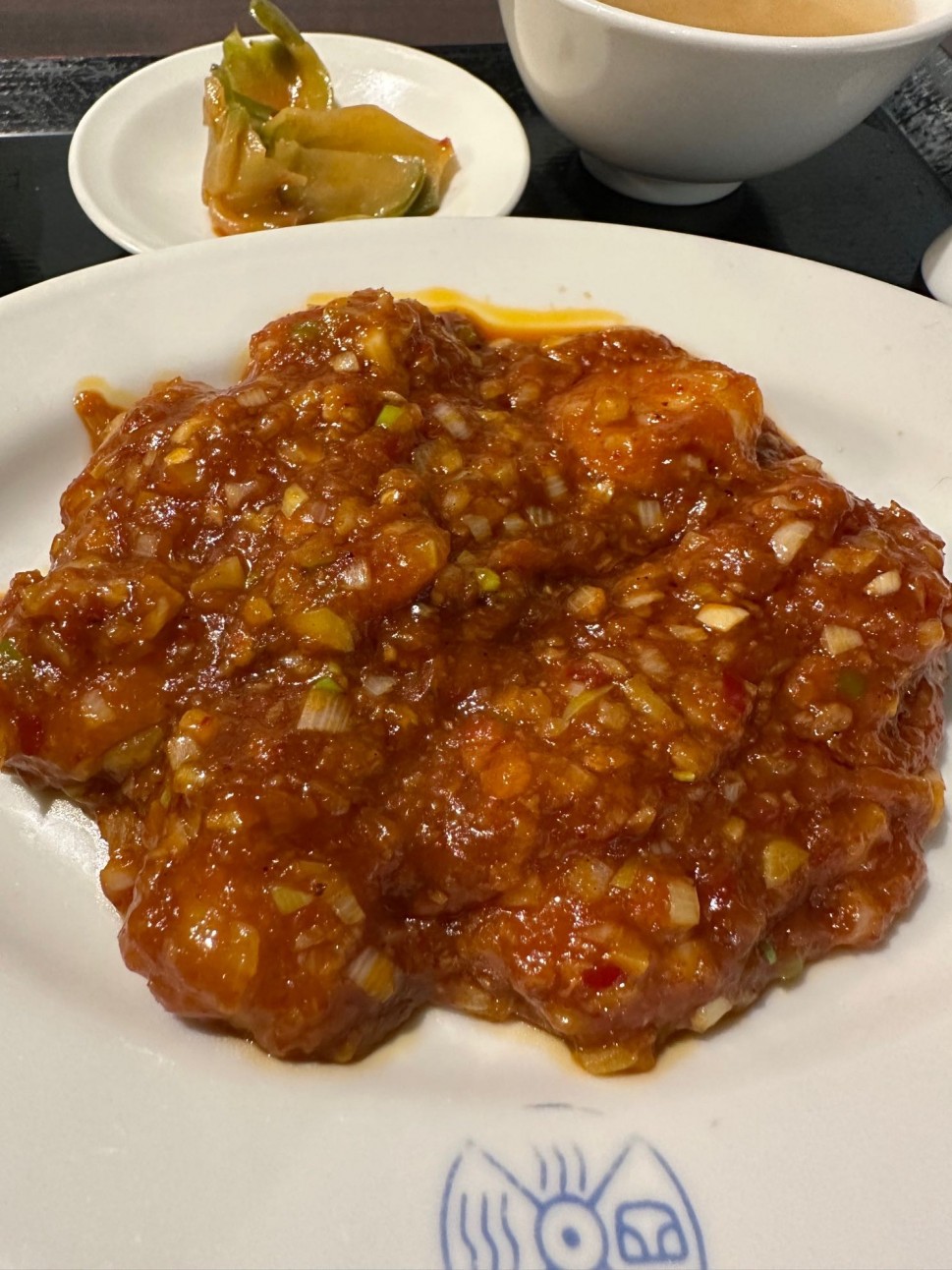 ランチのエビチリセット。エビは小ぶりですが、抜群のとろみがある旨辛アンが最高です。ご飯がすすむ一品